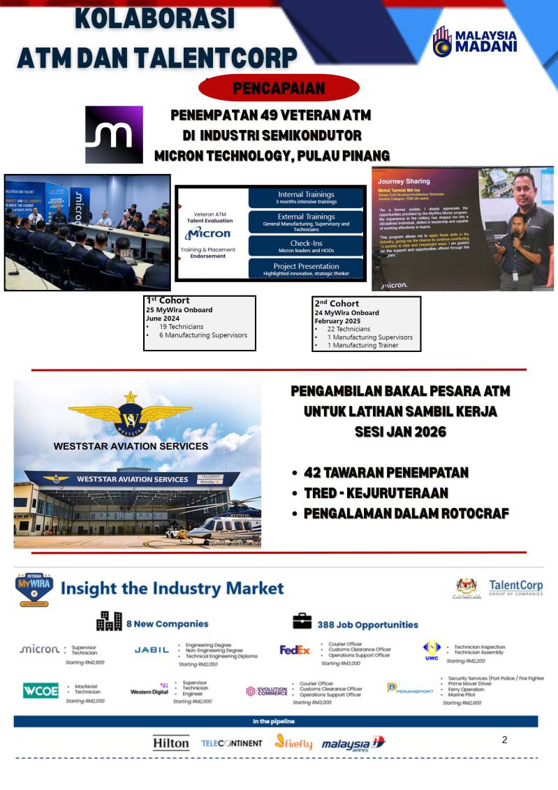 “Peralihan daripada perkhidmatan tentera ke pekerjaan sivil adalah satu fasa kritikal. Dengan adanya sokongan daripada TalentCorp dan pihak industri, kami mengambil langkah proaktif memperkukuh kebolehpasaran veteran dan meningkatkan kualiti kehidupan mereka,” katanya.
